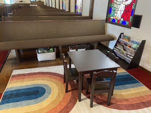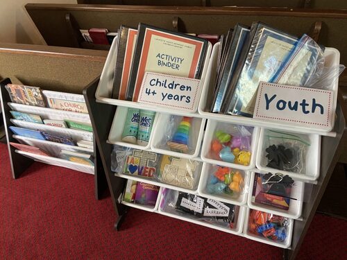 There is a “pray-ground” located at the front left of the Sanctuary, and we invite children and their adults to utilize that space during the worship service. The pray-ground is for children (with their adults) so they are able to engage with different activities while also being able to see and hear what’s happening in the service.